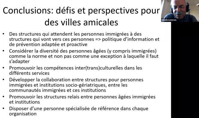 Assemblée annuelle, le 20 mars 2024, et lancement du thème annuel : Quelle place pour les personnes âgées immigrées dans les villes suisses ? Lors de l’assemblée annuelle, Claudio Bolzman, professeur à la Haute école de travail social de Genève et président du Forum national « Âge et migration », a partagé sa profonde expertise avec les membres. De nombreux thèmes liés au vieillissement concernent aussi bien les migrant·e·s que les personnes non issues de la migration. L’exposé d’ouverture de Monsieur Bolzman a toutefois clairement montré que les personnes âgées issues de la migration ont en outre des besoins spécifiques et un besoin de soutien conséquent.