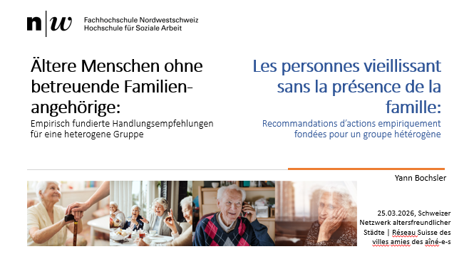 Assemblée annuelle, le 25 mars 2026, et lancement du thème annuel : cette année, notre réseau se consacre au thème «Vieillir sans proches aidants». Dr. Yann Bochsler, collaborateur scientifique et chef de projet à l’Institut de planification sociale, de changement organisationnel et de développement urbain de la Haute école spécialisée du nord-ouest de la Suisse (FHNW), est coauteur de l’étude «Vieillir sans la présence de la famille» de le FHNW. Lors de l’assemblée annuelle, il a abordé dans son exposé les éléments centraux de l’étude, a partagé quelques conclusions et recommandations d’action pour le travail auprès des personnes âgées et de la politique en de la vieillesse.
